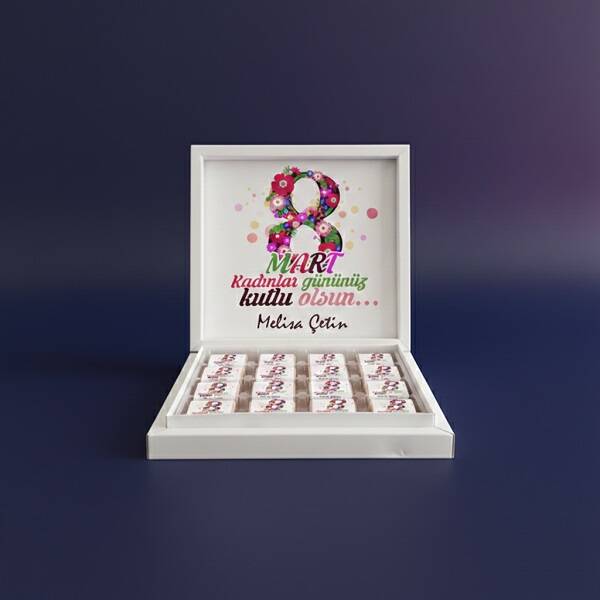 Kız arkadaşınız, eşiniz, anneniz ve ya çevrenizdeki kadın tanıdıklarınız için çiçekler veya çikolatalar gibi etkileyici hediyeler seçerek, onların kadınlık gururlarını okşayabilir ve gözlerinde ne kadar ince zevkli bir adam olduğunuzu hissettirebilirsiniz. Misal; hem şahane tasarıma sahip çikolata kutusu, hem içerisinde yer alan kişiye özel çikolatalarıyla 8 Mart Temalı Kadınlar Günü Çikolatası, sevdiğiniz tüm kadınlara eşsiz mutluluklar tattıracak harika bir hediye olacaktır. Siz de kadınlar gününde klişe hediyeler görmekten sıkılanlardan mısınız? O halde Hediyemen.com'un kadınlara özel olarak hazırladığı mükemmel hediyelerden mutlaka yararlanın!8 Mart Temalı Kadınlar Günü Çikolatası Hakkında Bilinmesi Gerekenler1 -) Ürün, beyaz renk şık ve kaliteli hediye kutusu içerisinde gönderilmektedir.2 -) Hediye Kutusu ölçüleri :22 x 22 x 3,50 cm.dir. .3 -) Tercihe bağlı olarak 16'li,32'li ve 48' adetli olarak sipariş verebilirsiniz. Çikolatalar kare şeklinde sütlü çikolatadır.4 -) Çikolatalarımız MABEL olup tazedir. Çikolata ölçüleri 4 X 4 cm.dir.5 -) Ürün kişiselleştirme çikolata ambalajı üzerine ve çikolata kutusunun iç yüzeyine yapılmaktadır.6 -) 8 Mart Kadınlar Gününe Özel Çikolata Kutusu, hafta içi saat 14:00'a kadar verilen siparişlerde Aynı Gün Kargoya teslim edilmektedir.Ürün Etiketleri