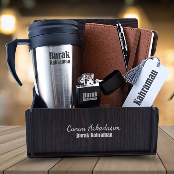 En yakın erkek arkadaşınıza, sevgilinize, babanıza veya biricik kocanıza etkileyici ve bir o kadar da prestijli bir hediye sepetini yeni iş hediyesi, iş terfi hediyesi ya da ofis armağanı olarak sunabilirsiniz. Zira kişiselleştirilebilir şık ahşap kutusu içerisinde ofis yaşamının vazgeçilmezlerinin yer aldığı Arkadaşa Özel Prestijli Hediye Seti, sevdiğiniz bir erkeğe adam gibi bir hediye olacak. İçerisinde kişiye özel kalem, defter, termos bardak, çakmak ve kitap okuma ayracının yer aldığı bu hediye kutusu ile sevdiklerinizi büyülemek ve başarı dileklerinizi Onlara iletmek işte bu kadar basit.