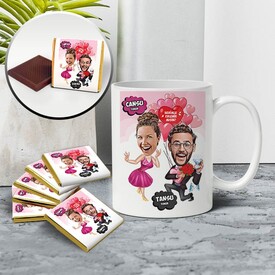 Aşk Dolu Çiftler Karikatürlü Kupa ve Çikolata
