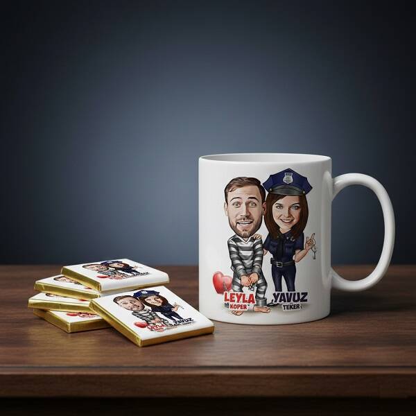 Aşka Mahkumuz Karikatürlü Kupa ve Çikolata