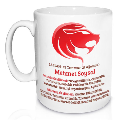 ASLAN BURCUNA HEDİYE ÖZEL KUPA BARDAK: Aslan burcu kadını kendine inanılmaz derecede çok güvenir. Hem dürüst, hem cesur ve hem de iyi niyetli yapısıyla herkes tarafından çok sevilirler. Aslan burcu kadın için en büyük ihanet; Ona yalan söylenmesidir. Yılandan korkmam yalandan korktuğum kadar felsefesi en çok bu burcun üyesi kadınlar için geçerlidir. Her zaman öteki insanlardan farklı olmaya çalışan aslan burcu kadınına ne hediye alınabilir? İşte karşınızda aslan burcu bayanları için en güzel hediye seçeneklerinden biri olan kupa bardak! Aslan burcu kadın ve erkekleri için iş yerlerinde keyifle kullanabilecekleri bu özel kahve kupası her zaman sizi hatırlatacaktır. Üzerinde Aslan Burcunun simgesi bulunan bu özel kupa, sahibinin ismine özel olarak hazırlanıyor. Aslan burcunun olumlu ve olumsuz özellerini üzerinde taşıyan Kupa Bardakla, bu burcun özelliklerini taşıyan erkek arkadaşlarınıza en güzel hediyelerden birini verebilirsiniz.