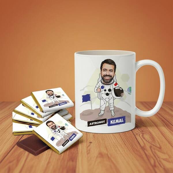 Astronot karikatürlü kupa ve çikolata ile uzaya olan merakını tatmin edin. Hem eğlenceli kupa bardak, hem de lezzetli çikolatalarla gökyüzüne uzanan bir hediye sunun.