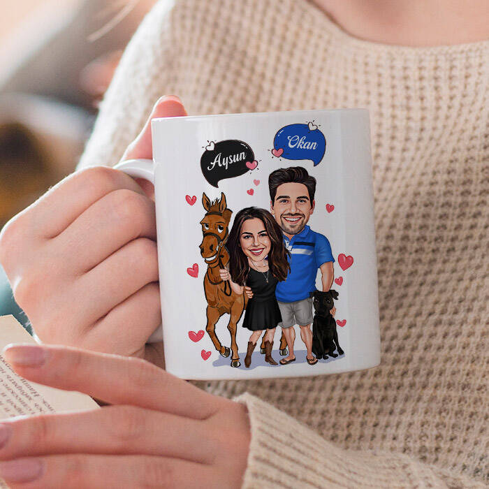 Günün monotonluğundan sıyrılmanın ve sevgilinize unutulmaz bir hediye vermenin tam zamanı! Atı ve köpeği olan çiftler için özel olarak tasarlanmış bu kupa bardak, sadece sıcak içeceklerinizi değil, aynı zamanda gülümsemelerinizi de ısıtacak. Sol tarafta sevimli bir at, önlerinde ise sadık bir köpek ve birbirine sıkıca sarılmış bir çiftin karikatürü, bu bardağın üzerinde eğlenceli anlar yaşamanıza olanak tanıyacak.