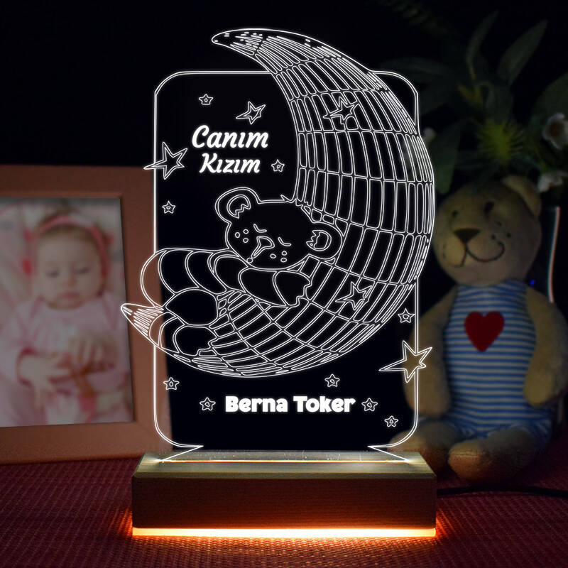 1 -) isim yazdırabileceğiniz 3D lamba boyutları 16 x 15 cm'dr.2 -) Kaliteli ahşap stand 12.5 X 4 X 2.5 cm'dir. Ürün şık hediye paketi içerisinde gönderilmektedir.3 -) Yüksek kaliteli ve uzun ömürlü led lamba. Dekoratif amaçlı ev ve iş yerlerinde kullanılabilir.4 -) Gece ışığa karşı duyarlı olanlar için göz yormayan Led ışıklarına sahiptir.5 -) KUTU İÇERİSİNDE; 1 Adet 3 boyutlu plexiglass tasarım, 1 adet 12V 1A adaptör, 1 adet ahşap kaide bulunmaktadır.6 -) Ayıcık Uyuyor Kız Bebeklere Özel 3D Led Lamba, zorunlu haller dışında hafta içi saat 14.00'a kadar verilecek siparişlerde aynı gün kargoya teslim edilmektedir.Ürün Etiketleri