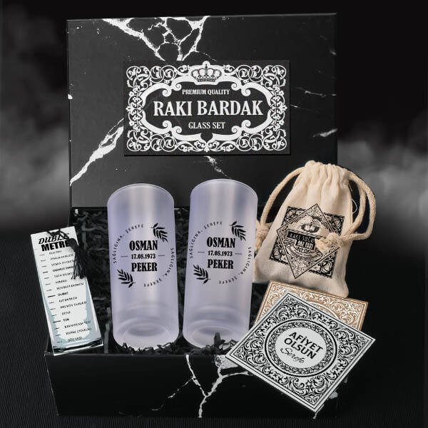 1 -) 18 X 24 X 10 cm mermer desenli siyah hediye kutulu konsept hediye kutusu içerisinde;** 2 Adet Kaliteli Rakı Bardağı.** 4 Adet Alkol Soğutma Taşı** 2 Adet Özel tasarım "Afiyet Olsun" ve "Şerefe" mesajlı ahşap bardak altlığı.** 1 Adet esprili bir dille hazırlanmış Duble Metre.2 -) Özel tasarım siyah hediye kutusunda şık bir şekilde gönderilmektedir.3 -) Rakı kadehleri üzerine silinmeyecek baskı tekniği ile kişiselleştirme yapılmaktadır.4 -) Babaya Hediye Rakı Kadehi Seti Hediye Kutusu hafta içi saat 14.00'a kadar verilecek siparişlerde aynı gün kargoya teslim edilmektedir.Ürün Etiketleri