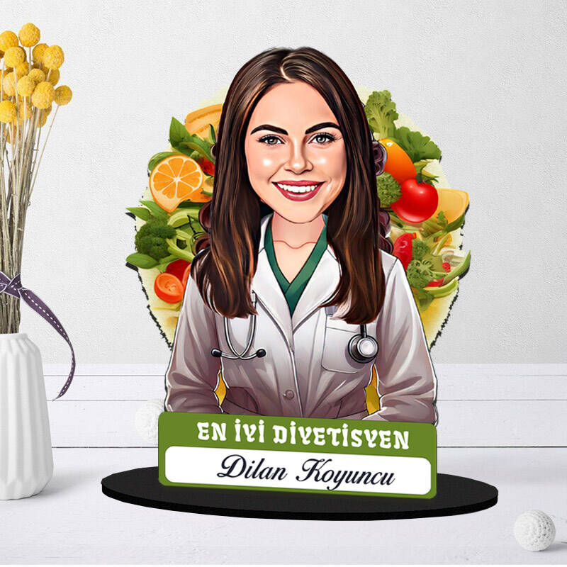 Başarılı Kadın Diyetisyen Karikatürlü Biblo Sağlıklı yaşamın simgesi olan kadın diyetisyeninize, karikatürlü ve kişiye özel tasarlanmış bu bibloyu hediye ederek, ona olan sevginizi ve mesleğine olan saygınızı gösterebilirsiniz. Kendisini sürekli motive edecek bu renkli tasarım, masasında ya da ofisinde en özel köşe olacak. Hem şık hem anlamlı bir hediye seçeneği.