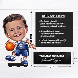 1 -) Biblo Ölçüleri: 18 cm uzunluk - Kaide ölçüleri: 9 x 3 cm.2 -) Karikatür baskısı 3 mm kalınlıkta kaliteli MDF malzeme üzerine uygulanmaktadır.3 -) Ahşap kaidesi siyah renk MDF malzemeden üretilmiş olup, dilediğiniz isim veya mesaj lazer ile üzerine kazınmaktadır.4 -) Bu Bibloyu kişiye özel hale getirebilmemiz için Sepete Ekle butonu üzerindeki kişiselleştirme alanlarını doldurmanız gerekmektedir.5 -) Basketbol Oyuncusu Çocuk Karikatürlü Biblo hafta içi saat 14.00'a kadar verilecek siparişler için aynı gün kargoya teslim edilmektedir.6 -) Lütfen Dikkat; karikatür çalışmasının daha kaliteli olabilmesi için yükleyeceğiniz fotoğrafın ön cepheden çekilmiş olmasına ve net olmasına önem gösteriniz.7 -) Ürün üzerindeki karikatür, elle çizilmiş bir karikatür olmayıp, bilgisayar programları yardımıyla yapılmaktadır.Ürün Etiketleri