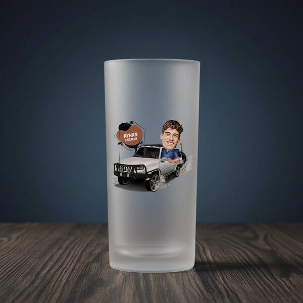 Beyaz Arazi Arabasında Erkek Karikatürlü Rakı Bardağı