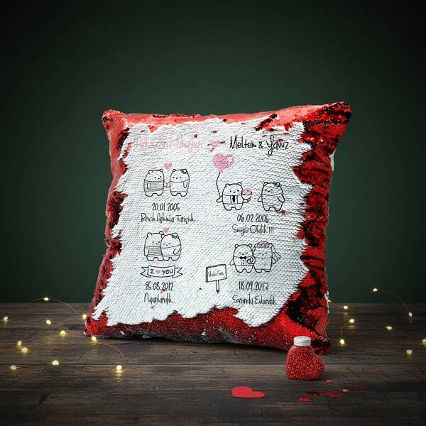 1 -) Yastık 40 x 40 cm. ölçülerinde olup, kare şeklindedir. Üzerinde kırmızı renkte ışıltılı payetler bulunmaktadır.2 -) Pulları aynı istikamete doğru çevirdiğinizde payetlerin arkasına basılı olan fotoğrafınızı görebilirsiniz.3 -) Ters tarafa doğru payetleri ittiğinizde ise kırmızı ışıltılı pullarla karşılaşacaksınız.4 -) Sihirli yastık mekanlarınız için oldukça dekoratif özellikte bir yastık modelidir. Koltuk köşesi süslemesi için idealdir.5 -) Siparişiniz halinde, içi kaliteli boncuk elyaf dolgulu şekilde gönderilecektir.6 -) Bu Bir Aşk Hikayesi Sihirli Yastık hafta içi saat 14.00'a kadar sipariş vermeniz halinde aynı gün kargoya teslim ediyoruz.7 -) Yastık ütülenmemelidir ve 40 derecede ılık suda elde yıkanması tavsiye edilmektedir.Ürün Etiketleri
