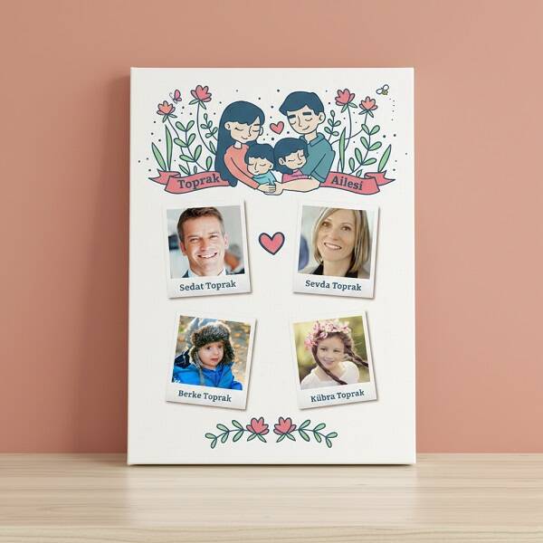 Mutlu aile tablonuz, salon duvarlarınıza çok yakışacak! Kişiye özel olarak hazırlanan Fotoğraflı ve İsim Yazılı Ailem Kanvas Tablo renkli salonunuzu daha özel ve daha sevgi dolu hale getiriyor. Üzerine kendinizin, eşinizin ve çocuklarınızın fotoğraflarını taşıyabileceğiniz ve her fotoğrafın altına da isimlerinizin yazılı olacağı bu özel tablo ile eşinize ve çocuklarınıza hoş bir sürpriz yapabilirsiniz.