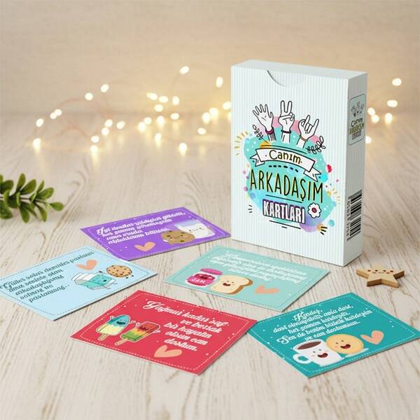 Her biri titiz ve özel bir çalışmanın eseri olan 50 adet arkadaşa güzel sözler yazılı kartlar, profesyonel grafik ekibimiz tarafından özel illustrasyonlarla hazırlandı. Birinci sınıf 240 gram kağıt üzerine aktarılan bu sözler- ile arkadaşıınıza verdiğiniz değeri ve Ona olan sevgiyinizi harika bir şekilde gösterebileceksiniz. Adeta 50 adet özel tasarım kartpostal tadında olan bu kartlar üzerinde arkadaş sevgisi odaklı cümleler yer alıyor. Örneğin; "Her daim neşen bol; mutluluğun daim olsun canım arkadaşım";"Sen nerede olursan ol, ben hep senin yanındayım Canım Arkadaşım..."," Güller solar, Demirler Paslanır; Ama seninle olan arkadaşlığımız ne solar; ne de paslanır..." şeklindeki sevgi dolu arkadaşlık mesajları içeren Canım Arkadaşım Kartları mahallenizden arkadaşınıza, okuldan arkadaşınıza, çocukluk arkadaşınıza, yıllarca beraber olduğunuz en yakın dostunuza yılbaşı, doğum günü için düşünebileceğiniz en yaratıcı hediyelerden biri.