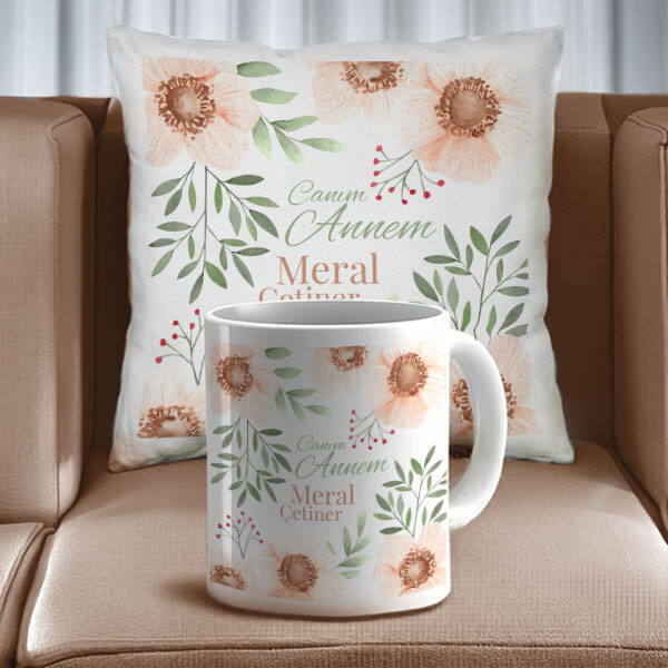 Çiçek Desenli Canım Annem Bardak ve Yastık Seti