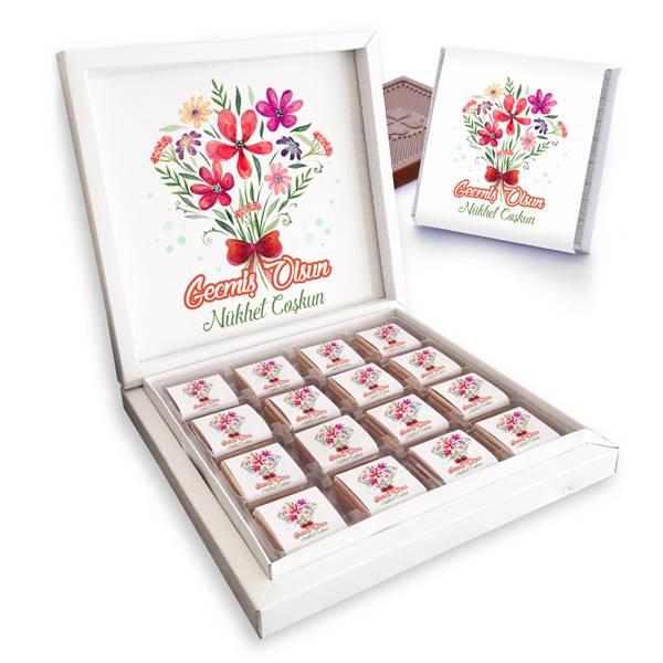 1 -) Ürün, beyaz renk şık ve kaliteli hediye kutusu içerisinde gönderilmektedir.2 -) Hediye Kutusu ölçüleri :22 x 22 x 3,50 cm.dir.3 -) Tercihe bağlı olarak 16'li,32'li ve 48' adetli olarak sipariş verebilirsiniz. Çikolatalar kare şeklinde sütlü çikolatadır.4 -) Çikolatalarımız MABEL olup tazedir. Çikolata ölçüleri 4 X 4 cm.dir.5 -) Ürün kişiselleştirme çikolata ambalajı üzerine ve çikolata kutusunun iç yüzeyine yapılmaktadır.6 -) Çiçek Motifli Geçmiş Olsun Çikolata Kutusu hafta içi saat 14:00'a kadar verilen siparişlerde Aynı Gün Kargoya teslim edilmektedir.Ürün Etiketleri
