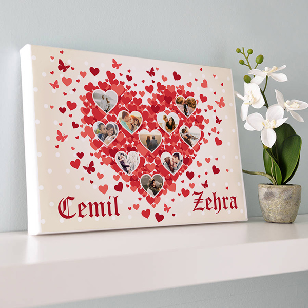 Özgün ve orijinal tasarımıyla başka hiçbir yerde rastlayamayacağınız özel bir çalışmamız olan bu romantik tabloyu sevgilinize hediye ederek her an sizi hatırlamasını sağlayabilirsiniz. Tamı tamına 10 fotoğrafınızla hazırlanacak olan isimlerinize özel bu kanvas tablo, mini kalp ve kelebek ikonları ile oldukça şık bir görünüm sergiliyor. Resimlerinizin kalp simgeler içerisine konumlandırılacağı ve ister yakından, ister uzaktan bakın her baktığınızda sevgilinize olan aşkınızın yeniden alevleneceği Kişiye Özel Çok Fotoğraflı Sevgili Kanvas Tablosuna şimdi kolaylıkla sahip olabilirsiniz.
