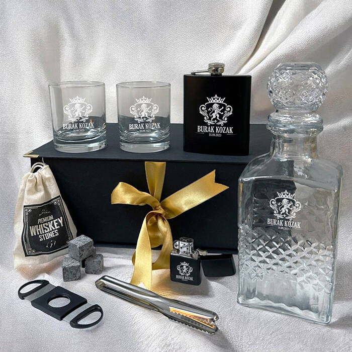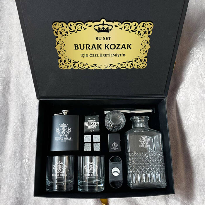 1 -) Siyah renkte fantezi kutu içerisinde gönderilmektedir. Kutu ölçüleri: 36 X 26 X 13 cm.2 -) Set içerisinde yer alan 2 Adet viski bardağı üzerine isim lazer ile kalıcı şekilde işlenmektedir. 8,5 cm X 9,5 cm genişliğindedir. Hacim 210 cc.3 -) Set içerisinde 2 adet Viski Bardağı + özel Kesede 4 Adet Viski Taşı + 1 Adet Metal Çakmak + 1 Adet Puro Makası + 1 Adet İçki matarası + 1 Adet Viski Şişesi ve Buz Tutacağı yer almaktadır.4 -) Viski tüketen sevdiklerinize harika bir hediye seçeneğidir.5 -) Bu premium set hafta içi saat 14.00'a kadar verilecek siparişler için aynı gün kargoya teslim edilmektedir.Ürün Etiketleri