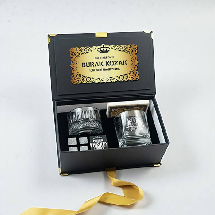 1 -) Fantezi siyah renkte özel bir kutu içerisinde gönderilmektedir. Kutu ölçüleri: 9,5 X 12,5 cm.2 -) Set içerisinde yer alan viski bardağı üzerine isim lazer ile kalıcı şekilde işlenmektedir. 8,5 cm X 9,5 cm genişliğindedir. Hacim 210 cc.3 -) Set içerisinde 1 adet Viski Bardağı + Kese içerisinde 4 Adet Viski Taşı + 1 Adet özel tasarım TAŞ bardak altlığı ve 1 Adet Cam çerezlik yer almaktadır.4 -) Viski tüketen sevdiklerinize harika bir hediye seçeneğidir.5 -) Lüks Viski Hediye Kutusu hafta içi saat 14.00'a kadar verilecek siparişler için aynı gün kargoya teslim edilmektedir.Ürün Etiketleri