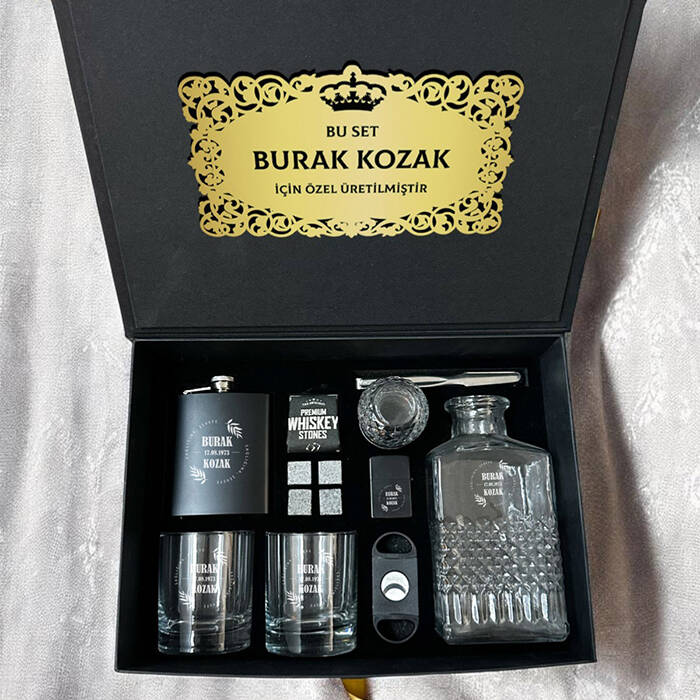 1 -) Siyah renkte fantezi kutu içerisinde gönderilmektedir. Kutu ölçüleri: 36 X 26 X 13 cm.2 -) Set içerisinde yer alan 2 Adet viski bardağı üzerine isim lazer ile kalıcı şekilde işlenmektedir. 8,5 cm X 9,5 cm genişliğindedir. Hacim 210 cc.3 -) Set içerisinde 2 adet Viski Bardağı + özel Kesede 4 Adet Viski Taşı + 1 Adet Metal Çakmak + 1 Adet Puro Makası + 1 Adet İçki matarası + 1 Adet Viski Şişesi ve Buz Tutacağı yer almaktadır.4 -) Viski tüketen sevdiklerinize harika bir hediye seçeneğidir.5 -) Bu premium set hafta içi saat 14.00'a kadar verilecek siparişler için aynı gün kargoya teslim edilmektedir.Ürün Etiketleri