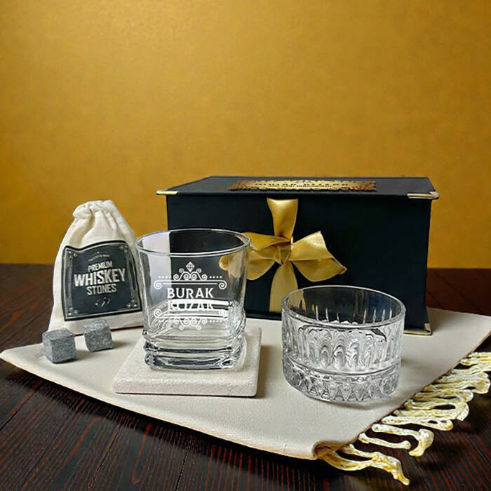 1 -) Fantezi siyah renkte özel bir kutu içerisinde gönderilmektedir. Kutu ölçüleri: 9,5 X 12,5 cm.2 -) Set içerisinde yer alan viski bardağı üzerine isim lazer ile kalıcı şekilde işlenmektedir. 8,5 cm X 9,5 cm genişliğindedir. Hacim 210 cc.3 -) Set içerisinde 1 adet Viski Bardağı + Kese içerisinde 4 Adet Viski Taşı + 1 Adet özel tasarım TAŞ bardak altlığı ve 1 Adet Cam çerezlik yer almaktadır.4 -) Viski tüketen sevdiklerinize harika bir hediye seçeneğidir.5 -) Lüks Viski Hediye Kutusu hafta içi saat 14.00'a kadar verilecek siparişler için aynı gün kargoya teslim edilmektedir.Ürün Etiketleri