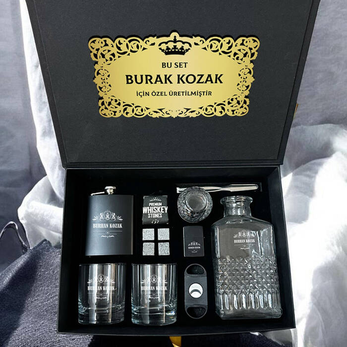 1 -) Siyah renkte fantezi kutu içerisinde gönderilmektedir. Kutu ölçüleri: 36 X 26 X 13 cm.2 -) Set içerisinde yer alan 2 Adet viski bardağı üzerine isim lazer ile kalıcı şekilde işlenmektedir. 8,5 cm X 9,5 cm genişliğindedir. Hacim 210 cc.3 -) Set içerisinde 2 adet Viski Bardağı + özel Kesede 4 Adet Viski Taşı + 1 Adet Metal Çakmak + 1 Adet Puro Makası + 1 Adet İçki matarası + 1 Adet Viski Şişesi ve Buz Tutacağı yer almaktadır.4 -) Viski tüketen sevdiklerinize harika bir hediye seçeneğidir.5 -) Bu premium set hafta içi saat 14.00'a kadar verilecek siparişler için aynı gün kargoya teslim edilmektedir.Ürün Etiketleri