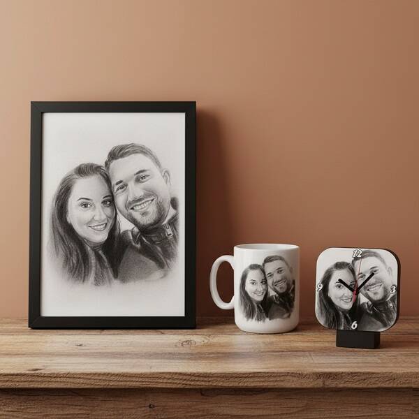 * Yine üzerine karakalem portre resim baskılı Kare Masa SaatiKarakalem Resim Hediye Seti Nasıl Hazırlanıyor?