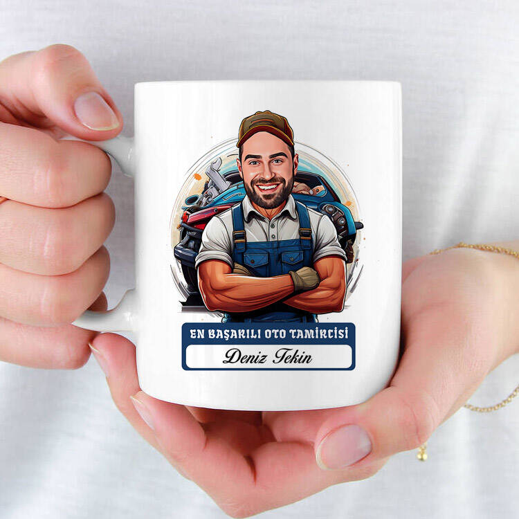 Motor sesleri arasında, elleri yağlı ama yüzleri gururlu olan oto tamircileri için özel olarak hazırlanan en başarılı erkek oto tamircisi karikatürlü kupa bardak, çay ve kahve molalarına enerji katıyor! Tamirhanede geçen uzun saatlerin arasında keyifli bir mola sunan bu kişiye özel kupa bardak, karikatür ve isim baskısıyla tam anlamıyla mesleği yansıtan harika bir tasarım. Oto tamircisi sevdiklerinize alabileceğiniz en esprili ve özel hediyelerden biri!