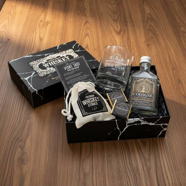 Misafirlerinizi özel bir akşam yemeği ile şaşırtın ve sonunda en özel bardaklarda ve en iyi ortamda servis edilen iyi bir viski ile servis yapın. 18 x 24 x 10 cm ölçülerindeki mermer desenli siyah şık kutumuzda özel tasarım kolonya, viski bardağı, viski taşları ve çikolatalar bulunuyor. Viski kadehlerini orijinal hale getirmek için camı bir metin, ad yazabilirsiniz. Kişiselleştirmek için yalnızca birkaç tıklamaya ihtiyacınız var.