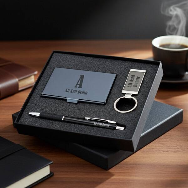 Hediye edileceği her erkeği fazlasıyla memnun edecek ve kendisini özel hissettirecek olan Erkeğe Kişiye Özel 3 lü Hediye Seti şimdi Hediyemen.com da. Babanıza, eşinize, patronunuza veya mesleğine yeni başlayacak olan erkek sevdiklerinize yeni iş hediyesi olarak armağan edebileceğiniz prestijli bir hediye seti ile daha karşınızdayız. Siyah renkteki özel şık kutusu içerisinde yer alan siyah kalem, parlak metal siyah kartvizitlik ve siyah renkteki metal anahtarlıktan oluşan bu özel 3 lü set, hediye edeceğiniz erkeğin ismine özel olarak hazırlanıyor.