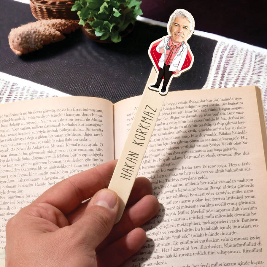 Tıbbi bir mola için sayfalar arasında bir doktor! Erkek doktor karikatürlü çubuk kitap ayracı, sağlık profesyonelleri için eğlenceli bir hediye seçeneği. Ahşap dokusu ve espri dolu tasarımıyla tıp dünyasının kahramanlarına saygı duruşu.