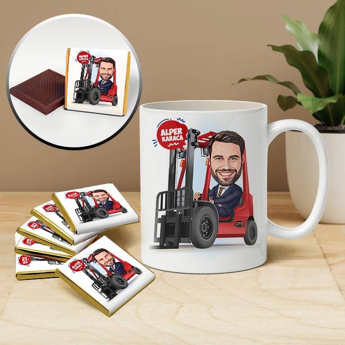 Forklift Kullanan Erkek Karikatürlü Kupa ve Çikolata
