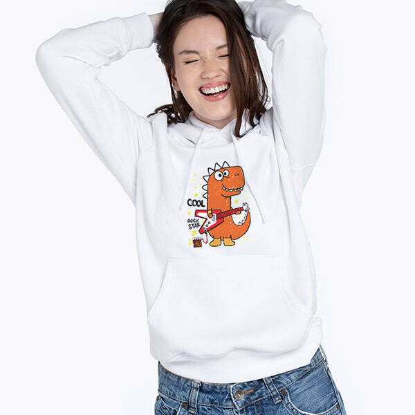 Müzik ve esprili tasarımları sevenler için eğlenceli bir tercih! Gitar çalan bir dinozor temasıyla süslenmiş bu beyaz kapşonlu sweatshirt, soğuk havalarda sizi sıcak tutarken, aynı zamanda müzik tutkunuzu yansıtmanıza yardımcı olacak. Farklı ve eğlenceli bir hediye seçeneği.