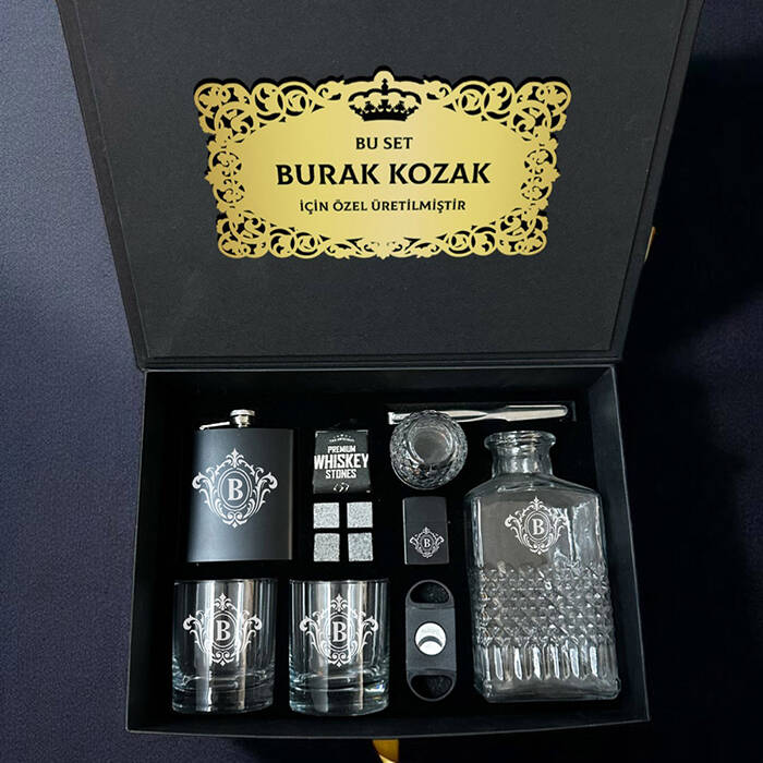 1 -) Siyah renkte fantezi kutu içerisinde gönderilmektedir. Kutu ölçüleri: 36 X 26 X 13 cm.2 -) Set içerisinde yer alan 2 Adet viski bardağı üzerine isim lazer ile kalıcı şekilde işlenmektedir. 8,5 cm X 9,5 cm genişliğindedir. Hacim 210 cc.3 -) Set içerisinde 2 adet Viski Bardağı + özel Kesede 4 Adet Viski Taşı + 1 Adet Metal Çakmak + 1 Adet Puro Makası + 1 Adet İçki matarası + 1 Adet Viski Şişesi ve Buz Tutacağı yer almaktadır.4 -) Viski tüketen sevdiklerinize harika bir hediye seçeneğidir.5 -) Bu premium set hafta içi saat 14.00'a kadar verilecek siparişler için aynı gün kargoya teslim edilmektedir.Ürün Etiketleri