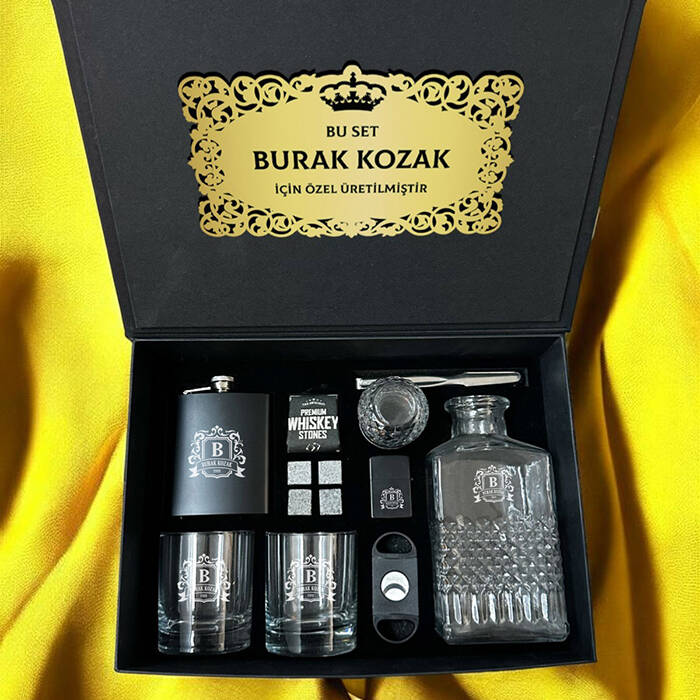 1 -) Siyah renkte fantezi kutu içerisinde gönderilmektedir. Kutu ölçüleri: 36 X 26 X 13 cm.2 -) Set içerisinde yer alan 2 Adet viski bardağı üzerine isim lazer ile kalıcı şekilde işlenmektedir. 8,5 cm X 9,5 cm genişliğindedir. Hacim 210 cc.3 -) Set içerisinde 2 adet Viski Bardağı + özel Kesede 4 Adet Viski Taşı + 1 Adet Metal Çakmak + 1 Adet Puro Makası + 1 Adet İçki matarası + 1 Adet Viski Şişesi ve Buz Tutacağı yer almaktadır.4 -) Viski tüketen sevdiklerinize harika bir hediye seçeneğidir.5 -) Bu premium set hafta içi saat 14.00'a kadar verilecek siparişler için aynı gün kargoya teslim edilmektedir.Ürün Etiketleri