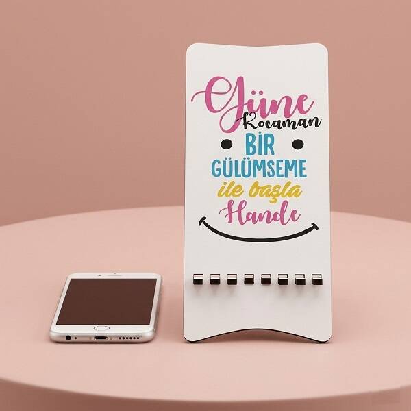 Güne kocaman gülümseme ile başla mesajı ile hazırlanan ahşap telefon standı, güne oldukça pozitif enerji yüklü başlamanızı sağlayacak. Güne Kocaman Bir Gülümseme İle Başla Ahşap Telefon Standı ile cep telefonunuzu üzerine sabitleyebilir, youtube üzerinden ellerinizi ağrımadan saatlerce video seyredebilir, pozitif mesajı ile güne mutlu başlayabilir ve ofis masanızdaki telefonunuzun o dağınıklık içinde kaybolmasını engelleyebilirsiniz. Oldukça enerjik mesajının yanı sıra, üzerine hediye edeceğiniz kişinin adınıda yazdırabileceğiniz bu ahşap telefon standını ofis arkadaşınıza, sevgilinize, telefon bağımlısı sevdiklerinize tüm özel günlerde hediye edebilirsiniz. Fonksiyonel ve kullanışlı yapısı ile sevdiklerinizin telefonlarını her daim göz önünde tutmalarını sağlayabilecekleri bu ahşap telefon standını hiç düşünmeden biricik aşkınıza hediye edebilirsiniz.