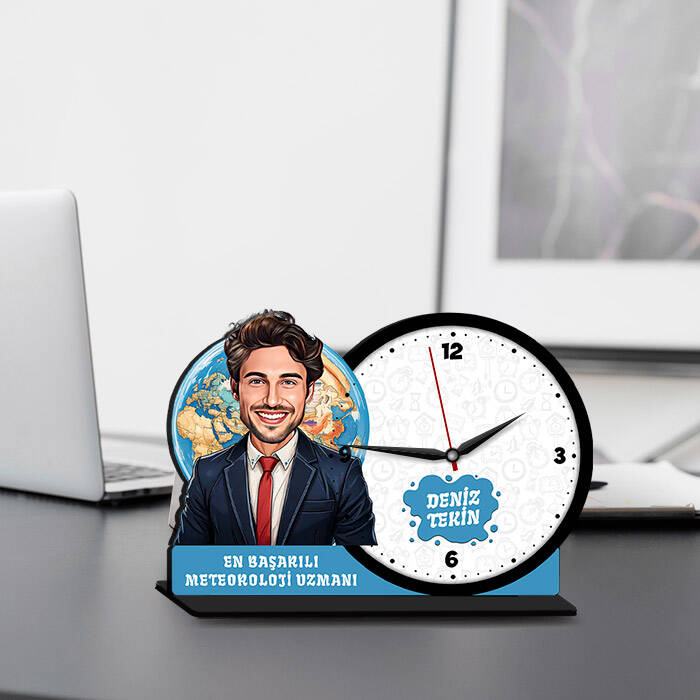 Erkek Meteoroloji Mühendisi Karikatürlü MDF Masa Saati