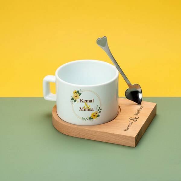 1 -) Fincan altlığı ahşap malzemeden (meşe ağacından) yapılmıştır. Üzerinde fincanı yerleştirmek için yuvarlak bir yuvası bulunmaktadır.2 -) Çay kaşığının ucu ve sapı kalp şeklinde bir tasarıma sahiptir. Mıknatıs özelliği sayesinde düşmez.3 -) Fincan 20 X 5,5 cm ölçülerine sahip olup, seramik malzemeden üretilmiştir.4 -) Siparişiniz halinde kaşık ve ahşap altlığıyla birlikte gönderilmektedir.5 -) İki İsimli Lüks Çay Fincanı, hafta içi saat 14.00'a kadar verilecek siparişlerde aynı gün kargoya teslim edilmektedir.Ürün Etiketleri