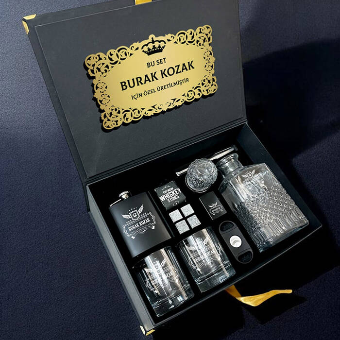 1 -) Siyah renkte fantezi kutu içerisinde gönderilmektedir. Kutu ölçüleri: 36 X 26 X 13 cm.2 -) Set içerisinde yer alan 2 Adet viski bardağı üzerine isim lazer ile kalıcı şekilde işlenmektedir. 8,5 cm X 9,5 cm genişliğindedir. Hacim 210 cc.3 -) Set içerisinde 2 adet Viski Bardağı + özel Kesede 4 Adet Viski Taşı + 1 Adet Metal Çakmak + 1 Adet Puro Makası + 1 Adet İçki matarası + 1 Adet Viski Şişesi ve Buz Tutacağı yer almaktadır.4 -) Viski tüketen sevdiklerinize harika bir hediye seçeneğidir.5 -) Bu premium set hafta içi saat 14.00'a kadar verilecek siparişler için aynı gün kargoya teslim edilmektedir.Ürün Etiketleri