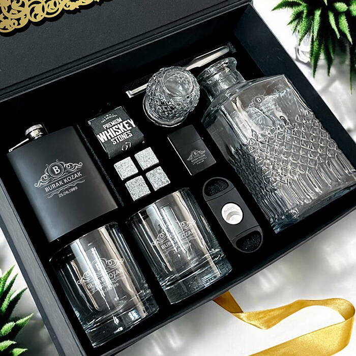 1 -) Siyah renkte fantezi kutu içerisinde gönderilmektedir. Kutu ölçüleri: 36 X 26 X 13 cm.2 -) Set içerisinde yer alan 2 Adet viski bardağı üzerine isim lazer ile kalıcı şekilde işlenmektedir. 8,5 cm X 9,5 cm genişliğindedir. Hacim 210 cc.3 -) Set içerisinde 2 adet Viski Bardağı + özel Kesede 4 Adet Viski Taşı + 1 Adet Metal Çakmak + 1 Adet Puro Makası + 1 Adet İçki matarası + 1 Adet Viski Şişesi ve Buz Tutacağı yer almaktadır.4 -) Viski tüketen sevdiklerinize harika bir hediye seçeneğidir.5 -) Bu premium set hafta içi saat 14.00'a kadar verilecek siparişler için aynı gün kargoya teslim edilmektedir.Ürün Etiketleri