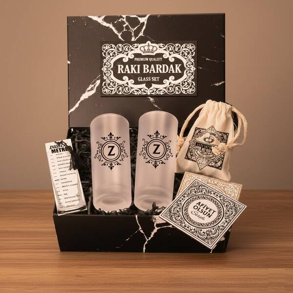 1 -) 18 X 24 X 10 cm mermer desenli siyah hediye kutulu konsept hediye kutusu içerisinde;** 2 Adet Kaliteli Rakı Bardağı.** 4 Adet Alkol Soğutma Taşı** 2 Adet Özel tasarım "Afiyet Olsun" ve "Şerefe" mesajlı ahşap bardak altlığı.** 1 Adet esprili bir dille hazırlanmış Duble Metre.2 -) Özel tasarım siyah hediye kutusunda şık bir şekilde gönderilmektedir.3 -) Rakı kadehleri üzerine silinmeyecek baskı tekniği ile kişiselleştirme yapılmaktadır.4 -) İsim Baş Harfli Rakı Kadehi Seti Hediye Kutusu hafta içi saat 14.00'a kadar verilecek siparişlerde aynı gün kargoya teslim edilmektedir.Ürün Etiketleri