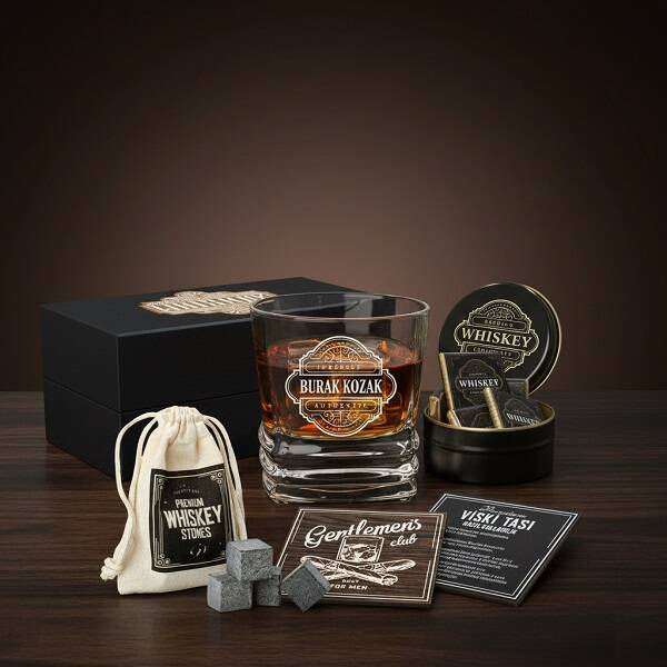 1 -) 18 X 24 X 10 cm mermer desenli siyah hediye kutulu konsept hediye kutusu içerisinde;** 1 Adet Kaliteli Elegan Viski Bardağı. İsme özel olup, viski bardağı ölçüleri 9 cm ve çapı 7 cm'dir. Kapasitesi 800 cc hacim ölçeğine sahiptir.** 4 Adet Viski Taşı** 4 Adet özel tasarım kare sütlü çikolata. Metal şık hediye kutusu içerisinde sunulur.** 2 adet özel tasarımlı ahşap bardak altlığı.2 -) Özel tasarım kutu içerisinde şık bir şekilde gönderilmektedir.3 -) Viski kadehleri üzerine lazer işleme tekniği ile kazıma yapılmakta olup asla silinmez özelliktedir.4 -) Elegan Viski Hediye Seti hafta içi saat 14.00'a kadar verilecek siparişlerde aynı gün kargoya teslim edilmektedir.Bilgilendirme: Satışı yapılan ürün, yalnızca içki servisi için tasarlanmış bir aksesuar setidir. Bu ürün alkollü içki içermez ve alkol tüketimini teşvik etme amacı taşımaz. 18 yaşından küçüklere alkollü içki satışı yasaktır. Aşırı alkol tüketimi sağlığa zararlıdır. Lütfen sorumlu bir şekilde tüketiniz.Ürün Etiketleri