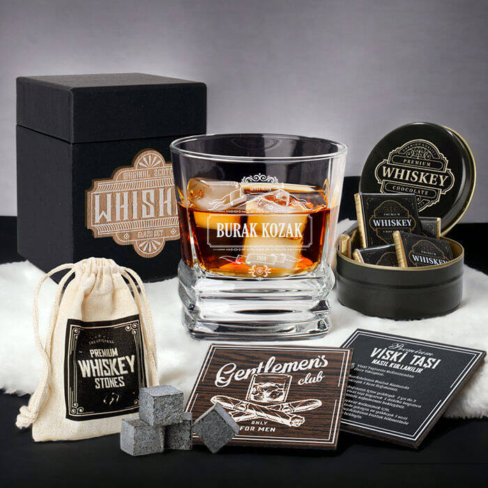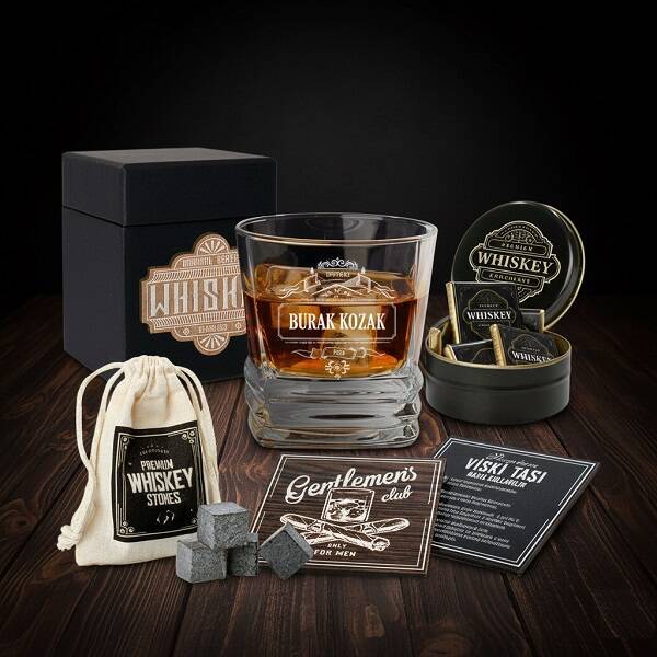 1 -) 18 X 24 X 10 cm mermer desenli siyah hediye kutulu konsept hediye kutusu içerisinde;** 1 Adet Kaliteli Elegan Viski Bardağı. İsme özel olup, viski bardağı ölçüleri 9 cm ve çapı 7 cm'dir. Kapasitesi 800 cc hacim ölçeğine sahiptir.** 4 Adet Viski Taşı** 4 Adet özel tasarım kare sütlü çikolata. Metal şık hediye kutusu içerisinde sunulur.** 2 adet özel tasarımlı ahşap bardak altlığı.2 -) Özel tasarım kutu içerisinde şık bir şekilde gönderilmektedir.3 -) Viski kadehleri üzerine lazer işleme tekniği ile kazıma yapılmakta olup asla silinmez özelliktedir.4 -) Elegan Viski Hediye Seti hafta içi saat 14.00'a kadar verilecek siparişlerde aynı gün kargoya teslim edilmektedir.Bilgilendirme: Satışı yapılan ürün, yalnızca içki servisi için tasarlanmış bir aksesuar setidir. Bu ürün alkollü içki içermez ve alkol tüketimini teşvik etme amacı taşımaz. 18 yaşından küçüklere alkollü içki satışı yasaktır. Aşırı alkol tüketimi sağlığa zararlıdır. Lütfen sorumlu bir şekilde tüketiniz.Ürün Etiketleri