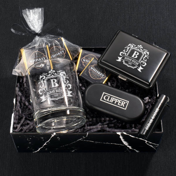 1 -) 18 X 24 X 10 cm mermer desenli siyah hediye kutulu konsept hediye kutusu içerisinde;** 1 Adet Kaliteli Viski Bardağı. İsme özel olup, viski bardağı ölçüleri 9 cm ve çapı 7 cm'dir. Kapasitesi 800 cc hacim ölçeğine sahiptir.** 6 Adet özel tasarım kare sütlü çikolata.** 1 Adet Kişiye Özel Clipper Marka Çakmak ve 1 Adet Metal Sigara Tabakası2 -) Özel tasarım kutu içerisinde şık bir şekilde gönderilmektedir.3 -) Viski kadehleri, çakmak ve sigara tabakası üzerine lazer işleme tekniği ile kazıma yapılmakta olup asla silinmez özelliktedir.4 -) İsim Yazılı Viski Bardağı Çakmak ve Sigaralık Hediyelik Set hafta içi saat 14.00'a kadar verilecek siparişlerde aynı gün kargoya teslim edilmektedir.Bilgilendirme: Satışı yapılan ürün, yalnızca içki servisi için tasarlanmış bir aksesuar setidir. Bu ürün alkollü içki içermez ve alkol tüketimini teşvik etme amacı taşımaz. 18 yaşından küçüklere alkollü içki satışı yasaktır. Aşırı alkol tüketimi sağlığa zararlıdır. Lütfen sorumlu bir şekilde tüketiniz.Ürün Etiketleri