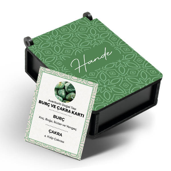 1 -) Orijinal Aventurin Taşıdır. İsme özel ahşap kutusu içerisinde zinciri ile gönderilmektedir.2 -) Kutusu üzerine yazmak istediğiniz ismi, sepete ekle butonu üzerindeki özelleştirme alanına girerek yazmanız gerekmektedir.3 -) Kutu içerisinde Aventurin taşının özellikleri ve faydalarını anlatan ahşap bir kart bulunmaktadır.4 -) İsme Özel Kutulu Aventurin Taşı Çubuk Kolye hafta içi saat 14.00'a kadar verilecek siparişlerde aynı gün kargoya teslim edilmektedir.Ürün Etiketleri