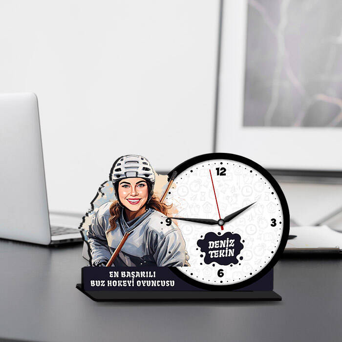 Kadın Buz Hokeyi Oyuncusu Karikatürlü MDF Masa Saati