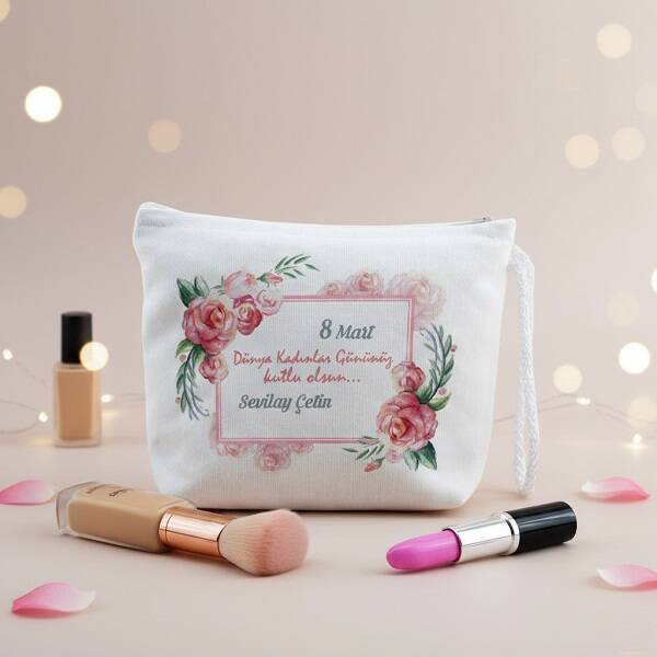 Kız arkadaşınızı, eşinizi veya biricik annenizi 8 Mart Kadınlar Gününde üzerine anlamlı bir mesaj yazdırabileceğiniz bu estetik makyaj çantasıyla çok mutlu edebilir, hayatınızdaki en değerli kadınına duygularınızı bu şekilde en güzel armağanla ifade edebilirsiniz. Üzerinde kadınlar gününe özel olarak çiçek motifleri ve estetik desenler yer alan cep çantası kişisel kutlama mesajınız ve armağan edeceğiniz isimle birlikte tasarlanıyor. Yani tamamen siz tasarlıyorsunuz! Kısacası dış görünümüne, bakımına ve makyajına her zaman önem veren bir bayana Kadınlar Gününe Özel Mesajlı Makyaj Çantasını gönül rahatlığıyla siz de alabilirsiniz.