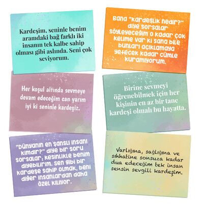 4 -) Kardeşim Hakkında Hissettiğim Şeyler Kartları, hafta içi saat 14:00'a kadar verilecek siparişlerde aynı gün kargoya teslim edilmektedir.Ürün Etiketleri