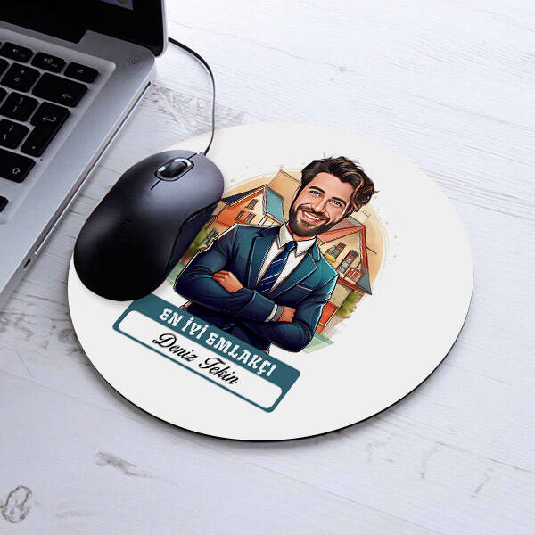 Gayrimenkul dünyasının profesyoneli erkek emlakçılarımız için tasarlanan bu mousepad, karikatür çizimleriyle evlerin ve ofislerin cazibesini masanıza getiriyor; kişiye özel üretimi sayesinde, her tıklayışınızda başarı ve güven dolu bir hikayeyi hatırlatıyor.