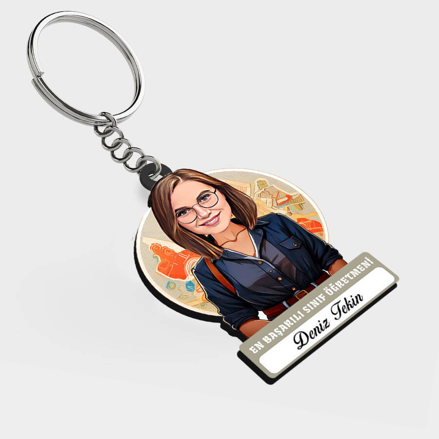Alfabeyi öğreten o sihirli ellere, hayatın en renkli harflerini bu karikatürle sunun. Okulun o koşturmacalı günlerinde anahtarlarını ararken her seferinde gülümsesin; ismine özel bu tasarım ona mesleğinin ne kadar kutsal olduğunu hatırlatsın. Bir öğretmene verilebilecek en dayanıklı ve en anlamlı hatıra.