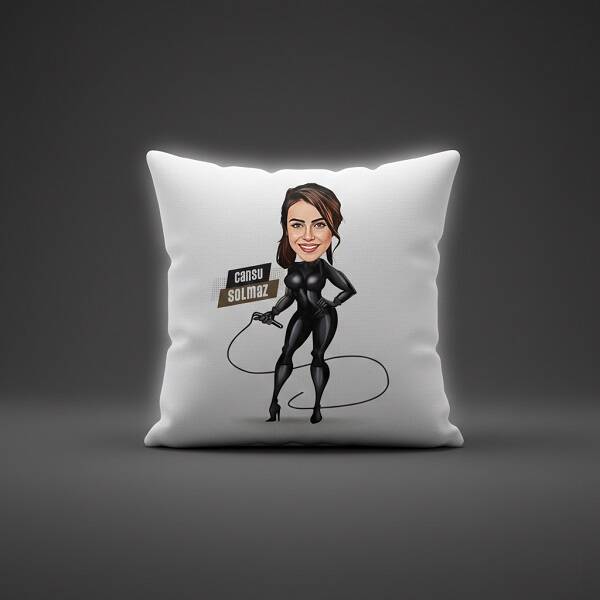 Kırbaçlı Deri Kıyafetli Kadın Karikatürlü Yastık