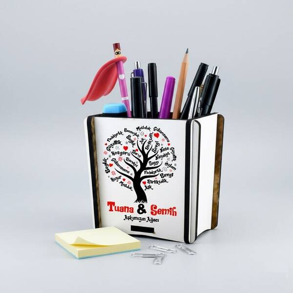 Üzerinde ilişkinizin geçmiş ve geleceği ile onlarca temenni mesajından bir ağaç oluşturularak tasarlanan bu kalemlik, sevgilinizin masasında konsantrasyon kaybına neden olacak kalemleri tek bir çatı altında toplayacak. Eğer sizinde sevgiliniz ofis ortamındaki çalışma masasının dağınıklığından, kalem ve araç gereçlerin düzensizliğinden şikayet ediyorsa; 2 günde solacak çiçek gönderek yerine her zaman işine yarayacağı Kişiye Özel Aşkımızın Ağacı Kalemliği hediye edebilirsiniz.