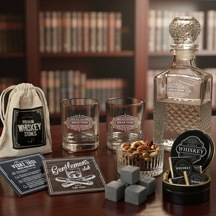 1 -) Özel tasarım kutu içerisinde şık bir şekilde gönderilmektedir. Kutu 18 X 24 X 10 cm mermer desenli siyah hediye kutulu konsept hediye kutusu içerisinde;** 2 Adet Kaliteli Viski Bardağı. İsme özel olup, viski bardağı ölçüleri 9 cm ve çapı 7 cm'dir. Kapasitesi 800 cc hacim ölçeğine sahiptir.** Özel tasarım keten kumaş içerisinde 4 Adet Viski Taşı** 4 Adet özel tasarım kare sütlü çikolata.** 1 Adet kişiye özel 750 ML kapasiteli viski şişesi ve Cam çerezlik.2 -) Viski kadehleri üzerine lazer işleme tekniği ile kazıma yapılmakta olup asla silinmez özelliktedir.3 -) Konsept Viski Hediye Kutusu hafta içi saat 14.00'a kadar verilecek siparişlerde aynı gün kargoya teslim edilmektedir.Ürün Etiketleri